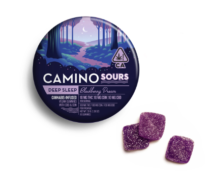 5mg: 1mg CBN 'Sleep' Midnight BlueberryOur top-selling product - and for a reason. When the day's demands set you up for a restless night there's a perfect companion waiting for you: Midnight Blueberry Camino ‘Sleep’ Gummies specially crafted to lull you into a deep and tranquil sleep that will leave you feeling truly refreshed.With a carefully crafted blend of 5MG THC and 1MG CBN with indica-like terpenes plus chamomile and lavender extracts these delicious gummies settle you down into a smooth slumber as if you’re underneath the stars.THC acts on CB1 receptors in the nervous system and has been associated with greater ease of falling asleep- as well as pain management which contributes to better sleep.CBN (aka Cannabinol) is shown in preliminary studies to have tranquil properties particularly when paired with THC.Chamomile is widely regarded as a sleep-inducer creating a mild effect that helps decrease anxiety.Lavender interacts with the neurotransmitter GABA to help soothe the brain and nervous system and reduce restlessnessWhen all these synergistic components come together the result is a restful night followed by a refreshed morning. Sweet dreams! The Terpenes include Beta-Caryophyllene Linalool Myrcene