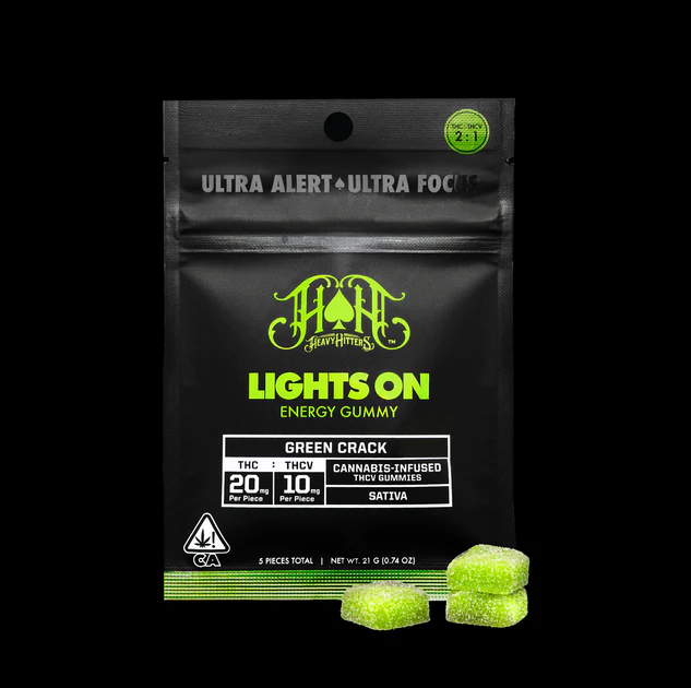 The Heavy Hitters Green Crack THCv Gummy is designed to be a lean mean green machine ready to get you high and hyped without the hunger.Green Crack also known as “Green Crush” is a potent uplifting super-sativa descended from the storied Skunk #1 strain and a still unknown landrace indica. With a kiwi and melon forward flavor and amped with a bold 2:1 ratio of THC and energizing THCv these gummies pack 30mg of total cannabinoids per piece enough to get you flying high and ready to seize the day minus the munchies.Gluten free dairy free and nut free.Flavor: A delicious blend of kiwi melon and subtle hits of sour appleStrain Type: Sativa