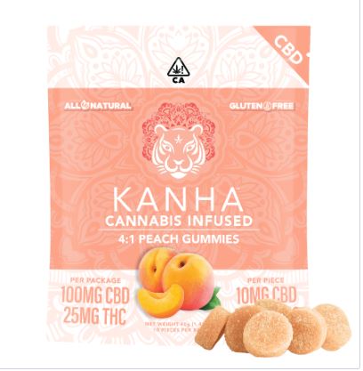 KANHA 4:1 Peach CBD Gummies100mg CBD x 25mg THC per bagThe peach a stone fruit that originated in Ancient China delights the palate with gentle floral sweetness spiked with sour and tangy notes. Packing all this flavor in a fluffy-soft base 4:1 Peach CBD delivers 10mg of CBD and a 2.5mg microdose of THC in each gummy with an added kick of flavors and aromas from terpenes like limonene α-humulene and myrcene. With limited THC elevation this gummy supports focus and concentration while providing the relaxing benefits of ample CBD content. Instructions: Eat 1 gummy. Wait 90 minutes for full effect. Keep in a cool dry place. Avoid temperatures over 75°F.Ingredients: Tapioca Syrup Cane Sugar Water Gelatin Agar Locust Bean Gum Citric Acid Carnauba Wax Natural Flavor Cannabis Oil and Natural Color.