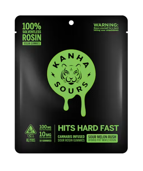 Melon flavor cranked to full volume. Each vegan gummy packs 10mg of fast-acting THC from solventless rosin from the hybrid strain Piff Mintz. With 100mg THC per pack, these gummies blend explosive sourness with a burst of vibrant watermelon flavor.
