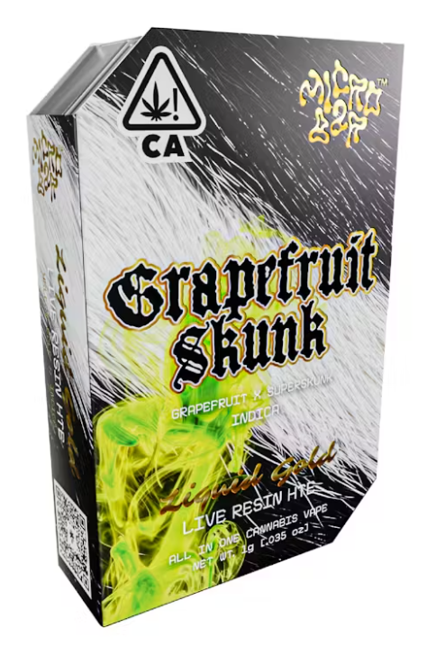 Grapefruit Skunk is an Indica, a cross of Grapefruit and Skunk. It delivers a mouthwatering mix of pine and gas with a loud, skunky aroma that fills the room. Potent in both taste and effect, it hits the mind and body with a heavy, balanced high. This strain is LOUD and unforgettable. Elevate your vibe with LIQUID GOLD Live Resin from Micro Bar. Made from fresh-frozen, strain-specific material, it delivers bold, full-spectrum flavor and effects. Our Flavor Flow Technology ensures smoother, cooler hits that preserve every terpene for pure taste and power.