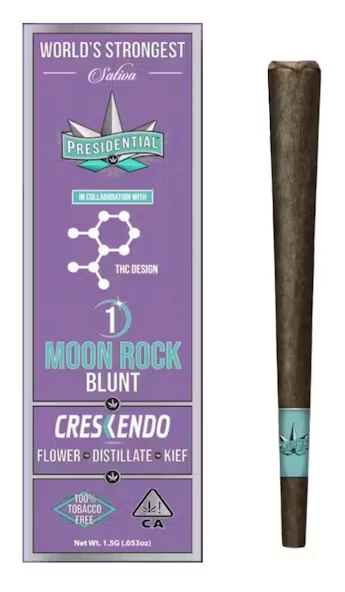 Launch off to the clouds with this 1.5g Moonrock Infused Blunt that contains the cannabis strain Crescendo from Presidential. Crescendo is a gorgeous Sativa cross between the genetics of Chem D x i95 x Mandarin Cookies x Headband. Presidential brings you top-shelf flower infused with tropical flavor Premium THC Distillate and the highest quality kief. Rolled in 100% tobacco-free blunt paper stuffed with the best top-shelf flower and fitted with a chlorine-free filter to allow for only the smoothest of hits Presidential’s Moon Rock infused blunts are the only thing you need to elevate your weekend. These premium joints are never rolled sprayed or dipped and are ALWAYS infused with premium distillate and kief. Recommended for those with a high tolerance or those looking for a good time these Presidential pre-rolls are sure to send you to the moon and back.