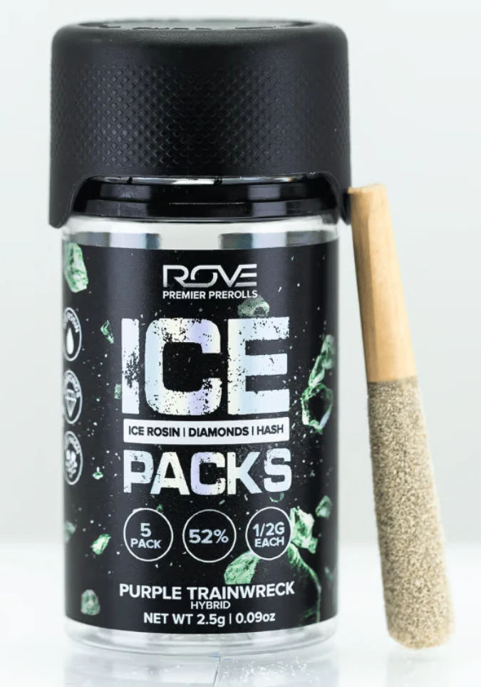Rove Ice Packs the world’s first triple-infused preroll. Made with premium-grade flower fully-infused with THCA diamonds and solventless ice hash rosin they're expertly rolled then coated with more ice hash. Super smooth and ultra potent Rove Ice Packs test at over 50% THC. Welcome to the next evolution of prerolls.Get ready to experience the ultimate balance of physical relaxation and mental stimulation with Purple Trainwreck! This hybrid strain is a powerhouse of effects that will keep you uplifted and energized for hours. Enjoy an unbeatable combination of deep relaxation and cerebral buzz - perfect for chill evenings creative sessions stress relief or just a great time.