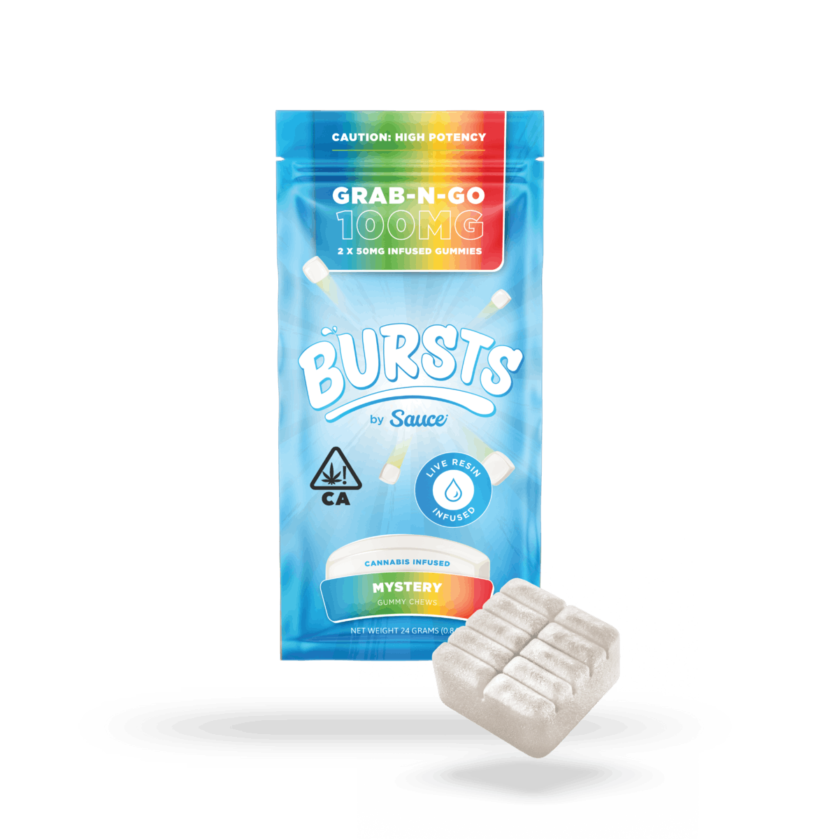 Our gummies are the best in the game! We have perfected the potency flavor ingredients process and activation time. Bursts by Sauce are powered by our 2X Nano Live Resin which is created using a proprietary process of both encapsulation and sonic energy to break down the molecule size. This makes the gummy hit faster harder and smoother than any other gummy. Our gummies are also organic and vegan and gluten free! *Tailor your dosage according to your personal preferences or embark on an intensely elevated adventure by eating the entire gummy. MYSTERY FLAVOR: Embark on a tantalizing adventure with our Mystery High Potency edible a flavor full of nostalgia. Launch into a captivating blend of cherry lime and blue raspberry that will bring you back to summers full of rocket pops and pool days. Let the mystery unfold and allow yourself to be pleasantly surprised by the alluring allure of our white Mystery edible.Enjoy consistent calming relief within minutes with the fastest activation on the market using our 2X Nano Indica Live Resin.